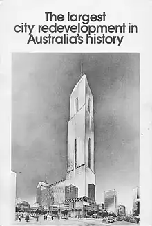 By the time registrations closed in March 1984 a total of 28 submissions had been received from developers, with eight selected organisations invited to respond.[6] A government panel sat in April 1985 to evaluate the responses, and one month later announced their preferred scheme: designed by Hassell Architects for EKG Developments, a joint venture between Australian property developer Essington Limited and Japanese construction firm Kumagai Gumi.[6] The project compromised an 85 floor office tower, with a hotel at the Swanston Street end, joined by a huge sloping walled atrium 20 floors high, over a shopping atrium opening down to the station platforms, designed by Hassell.[7]