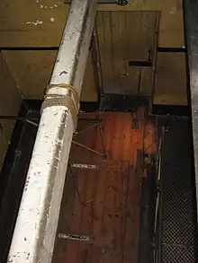 After 1864 a fixed gallows was installed below the octagon across the main axis of the prison block, against the wall dividing the male block from the female block. It comprised a single-leaf trap cut into the metal walkway, with iron sockets in either wall above, into which the beam was placed for each hanging (a common design, used in other Victorian gaols at Ararat, Geelong, Beechworth, Ballarat, Bendigo, Castlemaine, Melbourne and Pentridge; and interstate at Adelaide and Long Bay, New South Wales). It was later moved a few metres to a side gallery below the octagon, where it remains today.[14]