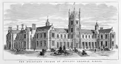 The origins of Melbourne Grammar School (colloquially known as Grammar) can be traced back to 1849, with the establishment of an experimental grammar school at St Peter's Eastern Hill, East Melbourne. This school had been established by Melbourne's first Church of England bishop, Charles Perry, who founded the Diocese of Melbourne, and had been opened to meet the growing educational needs of the young colony.[8] In 1853, Bishop Perry commenced planning for the diocesan experimental school to become permanent, although on a larger site and not under his direct management, and so he set up a committee of eminent men to consider the task. The school however did not thrive and was suspended at the end of 1854.[9]