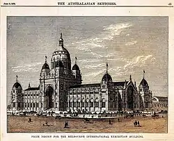 After being granted self-governance, Victoria (in 1851) and New South Wales (in 1856), saw a steady economic growth as result of the discovery and exploitation of gold reserves. This growth during the 1850s and 1860s led to rivalry between their respective capitals Melbourne and Sydney. In the 1870s the focus turned to the outside world and proposals were made for organising an exhibition modelled on the great exhibitions of Europe, with an aim to promote commerce and industry, along with art, science and education. Melbourne started preparations in 1879 and filed a plan to the Parliament. Melbourne's rival Sydney, the older of the two cities, wanted to be the first and organised an exhibition in record time.[1] This Sydney International Exhibition started in October 1879, but it focused mainly on agriculture, so it was not really universal and therefore did not meet the criteria for official recognition by the BIE. Melbourne decided to start their exhibition shortly after the one in Sydney, so the participants could transport their exhibits during the winter of 1880.[2]