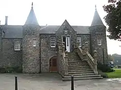 The nucleus of the house is the original part completed in 1625. In the 17th and 18th centuries the house was the seat of the Urquhart family. In the mid 18th century, the local laird, William Urquhart, who was the 4th Urquhat of Meldrum and 17th Chief of the Clan Urquhart, commissioned Oldmeldrum Town Hall.[3] Alterations were made to the surrounding structure of Meldrum House in the 18th and 19th centuries. Archibald Simpson reconstructed it as a symmetrical neo-Jacobean three-storey mansion in the late 1830s. W. L. Duncan further reconstructed it a century later at the request of then-owner Lady Doris Duff.[2]