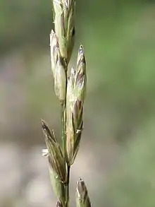 Melica californica is a perennial bunch grass, generally with rhizomes, producing a dense cluster of stems up to about 1.3 metres (4 ft 3 in) in maximum height. The inflorescence is a narrow series of purple-banded green spikelets.[1][2]