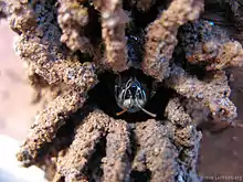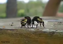 When a cell has been completed, the queen will fixate on the cell for inspection and push away workers from the cell. A worker will provision food into the cell and quickly retreat. Sometimes, when the queen is not around, a worker will lay an egg in the cell and quickly retreat from the area similar to when provisioning cells. During worker oviposition, or egg laying, the worker will be quiet with her wings closed and keep her body completely still as not to attract the queen. Worker oviposition will last an average of 7 seconds.[7] A worker's egg is about 2⁄3 the size of eggs laid by the queen.[7]