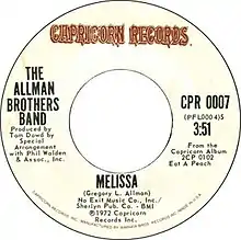 "Melissa" (sometimes called "Sweet Melissa") is a song by American rock band the Allman Brothers Band, released in August 1972 as the second single from the group's fourth album, Eat a Peach. The song was written by vocalist Gregg Allman in 1967, well before the founding of the group. Two demo versions from those years exist, including a version cut by the 31st of February, a band that featured Butch Trucks, the Allman Brothers' later drummer. Allman sold the publishing rights later that year, but they were reacquired by manager Phil Walden in 1972.