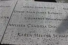 Melissa Cándida Doi (September 1, 1969 — September 11, 2001)[1] was an American businesswoman in the financial industry who was a victim of the September 11 attacks on the World Trade Center.[1][3][4][5] She is known for the recording of the 9-1-1 call she made during her final moments from inside the South Tower as it was engulfed in flames.[6] Her emotional conversation with an emergency dispatcher was used during the prosecution of Zacarias Moussaoui, the only criminal trial to result from the attacks.[7][8][9][10]
