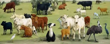 Reacting to disappearing natural habitats and the increasing number of imported species that she observed in Texas and the Southwest, Miller shifted from fantastical and mythic scenes to tableaux combining farm and exotic animals in her paintings and drawings of the early 2000s.[1][43] These paintings conveyed wary, almost-lazy calm and indifference and alluded to tenuous relationships among strangers, immigration, alienation, harmony and integration (e.g., Farm, 2002; Cluster, 2003).[1][43][37] This work often employed rigorously structured, frieze-like compositions of flattened landscapes rather than illusionistic space, which reviewers compared to Japanese screens and Persian miniatures, Giorgio Morandi still lifes, and pre-Renaissance groupings of people.[43][37][20]