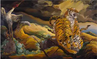Miller’s figurative paintings and drawings of the later 1970s arose out of her affinity for rural Texas and New Mexico environments and behavioral observation, and often portrayed lively, high-colored, seemingly ordinary farm vignettes (barnyard scenes, picnics) featuring both animals and people.[38][5][23] By the early 1980s, she shifted completely to scenes featuring animals—including exotic species—in moments of apprehension, fury or joy, finding in them more vital and immediate expressive possibilities.[12][3][26][39] Works such as Untitled (Tigers) (1982) and Leopard Dance (1983)—images of monkeys or a leopard dancing for audiences of tigers—or Flood (1983), which showed a pair of tigers and a crane perched on rocks amid a torrential downpour, depict primal, mysterious dramas that critics of the time described as novel, challenging and visionary.[40][41][24][35][42][29]