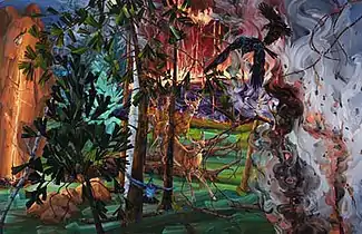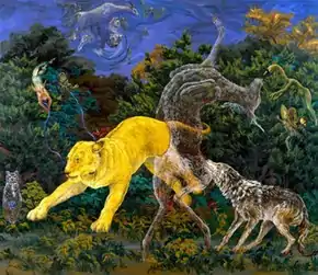 Miller's tableaux depict realistic yet subtly anthropomorphized animals in dramas that range from alarming to fantastical or wry and comment allegorically on wildlife (predator and prey, adaptation, survival, climate and ecological threat) and shared human themes (emotions, fears, interaction, displacement).[25][29][36][37] Reviews emphasize Miller's technique and formal concerns as much as her content, in particular, noting her expressive, varied brushwork, idiosyncratic color, and sense of light and pattern.[5][30][37] Arts Magazine suggested that her interest in animal subjects resulted as much from the opportunities to "exploit the sensuality, physicality, and tactility of the painted surface" as emotional, visual and allegorical concerns;[3] ARTnews observed that her paintings display a "remarkable conjunction of baroque composition"—recalling tumultuous hunting scenes by Delacroix, Rubens, and da Vinci—and Abstract Expressionist immediacy with regard to gesture, color and surface.[25][30]