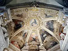 The frescos on the vault display The Story of Saint Nicholas of Tolentino painted by Giovanni da San Giovanni in 1623-27. The scenes are set in a richly detailed white and gold stucco frame and the eight panels are crowned with angel heads and ribbons. The central octagonal panel illusionistically opens toward the sky like an oculus; here the fresco displays the Glory of Saint Nicholas, the saint ascending to heaven among angels, one of them holding a lily. The original frescos of Giovanni da San Giovanni were hidden under the coarse 18th-century repainting until 1993. Although they were brought to light, the paintings remain in a precarious state and many of the finer details and the original colours were irretrievably lost. The 7 scenes are as follows (in clockwise order):