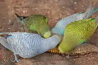 Budgerigars feed primarily on grass seeds.[30][5] The species also opportunistically depredates growing cereal crops and lawn grass seeds.[35] Due to the low water content of the seeds they rely on the availability of freshwater.[5]
