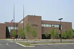 In 1975, a new "modern" Melrose High School opened next-door to the old one, which became the middle school. This building is renowned for its "open spaces," which were large open areas with movable walls.[7] Less than half of the buildings classrooms were in open spaces and the rest were triangular in shape. The school was supposedly built by an architect who also designed prisons and the building style reflects this. Numerous classrooms contain no windows and masonry is the main building material. Windows appear in a select few classrooms and are plentiful, yet most don't open. There is a constantly running air circulation system to combat the window problem and this also cools the building in the summer.
