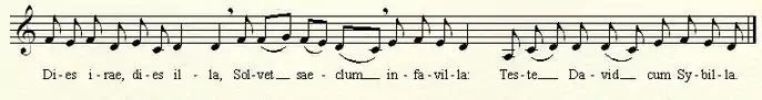 Following this, the music oscillates between the pitches of G and A-flat. The composer notes that this is because the astronomer Kepler believed those pitches to be the sound of the planet Earth.[1] Then there a further two statements of the Dies irae plainchant, by which the music reaches a solemn climax, followed by more somber music.[3]