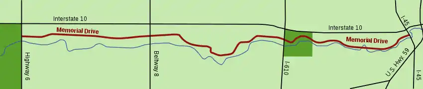 Memorial Drive is an arterial road in the western half of Houston, Texas, United States. It runs from Interstate 45 west to State Highway 6, a distance of approximately 20 miles (32 km). A 1-mile (1.6 km) section goes through several predominantly higher-income residential neighborhoods in the cities of Houston, Bunker Hill Village, Piney Point Village, and Hunters Creek Village, in addition to Memorial Park. Memorial Drive was named in the memory of the men who served in Camp Logan.[1]