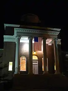 Memorial Hall is a symmetrical H-shaped building with one and a half stories and a full basement. It was designed by the Philadelphia firm of Day & Klauder as part of their overall campus master plan, which was drafted in 1917 with later revisions. The building features a Georgian Revival architectural style "reminiscent of Jefferson's designs for the University of Virginia", with exterior walls of Flemish bond brickwork and white wooden trim.[1] The majority of the windows are double-hung 12 over 12 sash windows, some of which are set in arched frames. Both the north and south facades of the building feature flat-roofed porticoes with Ionic columns. As originally built in 1924, the building consisted of only the hipped-roofed central hall and cupola with low wings on the east and west sides. During the 1940 rebuilding the central hall was expanded to the south to provide a new above-ground space for the library stacks, and gable-roofed extensions were added to the east and west wings.[1]