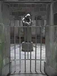 The mound measures 8 metres in diameter and is 5 metres tall. It is surrounded by tall trees and is reached along a narrow stone-lined passageway. Chiselled above the entrance is the inscription: "They who set out, never to return." At the top of the cupola is a metre-wide opening to let in daylight. At the centre of the room is the life-size figure of a woman who embraces her children, symbolizing Mother Denmark. Built into the wall are 9 bas-reliefs with symbolic descriptions of the emigrants' lives and activities abroad. In the floor is a five-pointed star representing the five continents.[1]