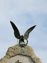 In front of the monument is a composition, which consists of three rifles with bayonets, leaning against each other, with a šajkača on top of the bayonet. At the top of the monument is a bronze figure of an eagle with outstretched wings, holding a laurel wreath in its beak. Rifles with shajkacs and an eagle with a laurel wreath have a common symbolism – marking the battle that ended with the Serbian victory. The rifles are no longer in action, so they are covered by the winner's hat, and the eagle, additionally symbolizing victory in the whole war, wears a wreath as a sign of victory, while its outstretched wings symbolize the won freedom.