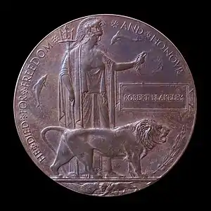 Carter Preston's winning design includes an image of Britannia holding a trident and standing with a lion. The designer's initials, E.CR.P., appear above the front paw. In her outstretched left hand Britannia holds an olive wreath above the ansate tablet bearing the deceased's name cast in raised letters. Below the name tablet, to the right of the lion, is an oak spray with acorns. The name does not include the rank since there was to be no distinction between sacrifices made by different individuals.[1] Two dolphins swim around Britannia, symbolizing Britain's sea power, and at the bottom a second lion is tearing apart the German eagle. The reverse is blank, making it a plaquette rather than a table medal. Around the picture the legend reads (in capitals) "He died for freedom and honour", or for the approximately 600 plaques issued to commemorate women, "She died for freedom and honour".[1]