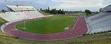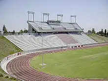 Memorial Stadium is a double-decked concrete and steel stadium in northeast Bakersfield, California, near the scenic Panorama Bluffs[1] which overlook the prolific Kern River Oilfields. In July 2019 an artificial playing surface was installed replacing the worn out and troublesome Bermuda grass field which was susceptible to fungus growth. An all-weather track was also installed[2] In 2020 a new scoreboard and sound system were installed along with new L.E.D. lights placed upon the original light standards.