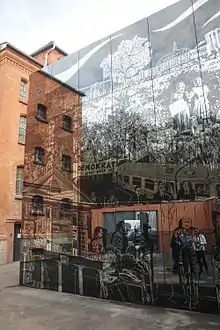 The "Kubus der Friedlichen Revolution" ("Cube of the Peaceful Revolution") was built in the courtyard. This is a 7.5-metre (25 ft) high glass cube, on which the story of the protest movement in Thuringia and the occupation of the prison and Stasi headquarters is told in the style of a graphic novel. The 40-metre-long (130 ft) mural, created by the artist Simon Schwartz wraps around the cube.[65] Schwartz used over 100 contemporaneous photographs as a basis for his drawings.[66]
