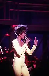 "Memories" was first performed live by Siti as a tribute to Houston at Dato' Siti Nurhaliza & Friends Concert on 2 April 2016.[9][11] During the performance, Siti sang live while being accompanied by prerecorded Houston's vocals and Houston's images and pictures that were projected on the backdrop.[10] While donning a striped sequin gold dress with a red base and side panels by Rizman Ruzaini,[17] Siti performed "Memories" as a "digital duet" right in front of more than 7000 people who attended the concert that night.[10] At the end of the performance, she cited the influence that Houston's songs had on her in order for her to learn proper vocal techniques.[18] She also added, "With the advancement of modern technology today, I am able to sing a duet with my idol."[18][lower-alpha 2]