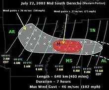 The Mid-South Derecho of 2003 was a severe derecho event that affected parts of the Southern United States, particularly southwestern Tennessee and northern Mississippi, including the Memphis metropolitan area.[2] It left 7 people dead and enormous damage across the region.