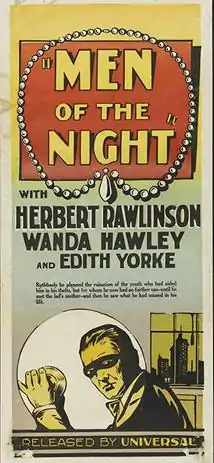 Men of the Night is a 1926 silent crime film directed by Albert S. Rogell and starring Herbert Rawlinson. It was produced and distributed by independent company Sterling Pictures.[1]