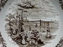 The Menai Suspension Bridge (Welsh: Pont y Borth, Pont Grog y Borth) is a suspension bridge spanning the Menai Strait between the island of Anglesey and the mainland of Wales. Designed by Thomas Telford and completed in 1826, it was the world's first major suspension bridge.[1] The bridge still carries road traffic and is a Grade I listed structure.[2]