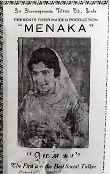 Menaka was an adaptation of the stage play of the same name which itself was adapted from a novel of the same name written by Vaduvoor K. Duraiswamy Iyengar. The film's screenplay was written by Kandhasamy Mudaliar. The film was released on 6 April 1935 became successful at the box-office and created a trendsetter for social themed films in Tamil.