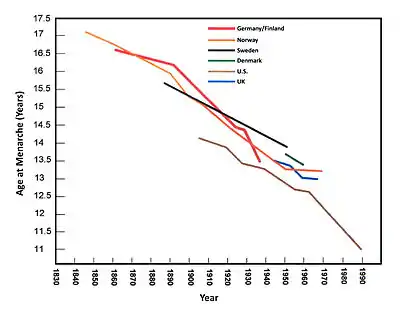 The average age of menarche was about 12.7 years in Canada at 2001.[8] and 12.9 in the United Kingdom.[9] A study of girls in Istanbul, Turkey, in 2011 found the median age at menarche to be 12.7 years.[10] In the United States, an analysis of 10,590 women aged 15–44 taken from the 2013–2017 round of the CDC’s National Survey of Family Growth found a median age of 11.9 years (down from 12.1 in 1995), with a mean of 12.5 years (down from 12.6).[11]