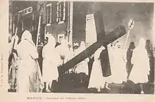 Of the Causses, Mont Mimat is the most significant. The causse is overhung by the Cross of Saint Privat. A first wooden cross was planted in 1900[9] or 1907.[10] It was replaced a few years later, on 8 July 1933, a Jubilee year, by a 12.5 metres (41 ft)-high iron cross. Until 1945, this cross was the place of large gatherings in honour of Mendois soldiers. This cross has been illuminated since the summer of 1965.[10] The mount also houses the chapel where Privat, the martyr of the Gévaudan, withdrew to. At its foot lies the area of Vabre where can be found the first remains of houses in the city. Opposite this is the Causse d'Auge (northeast) and the Causse du Crouzet (northwest), and the Margeride mountains beyond. To the west is Causse de Changefège, located between Mende and Barjac, which complements the borders of the city.