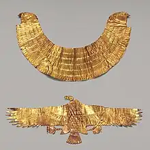There is uncertainty over the exact jewellery present in the tomb, as it was obtained on the art market, often with uncertain provenance.[33] Most of these items were in triplicate, particularly those made especially for the funeral.[17] Two gold headdresses are known from the tomb, the most obvious of which is a diadem with a busy design of rosettes and two gazelle heads. Wear indicates this piece was worn by one of the women in life. Gazelle diadems are depicted in art from the Eighteenth Dynasty, but no other gazelle diadem survives from ancient Egypt. It seems to have been associated with the goddess Hathor and with the women of the royal harem, as it is depicted being worn by princesses and royal ornaments.[34] The other headdress is a large wig cover with a palmette base plate and pendant chevrons and rosettes, resulting in the appearance of a jeweled wig; such a headdress is paralleled by that of Ahmose-Meritamun on her colossal outer coffin.[35] There are many additional inlaid rosettes whose original function is unclear but may represent an additional headdress or collar.[36]