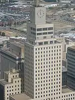 The Mercantile National Bank Building (known colloquially as The Merc) is a 31-story, 159.4 m (523 ft) skyscraper at 1800 Main Street in the Main Street district of downtown Dallas, Texas. It is the former home of the Mercantile National Bank, which later became MCorp Bank. The design of the skyscraper features Moderne styling from the Art Deco era and was designed by Walter W. Ahlschlager. The building has a series of setbacks that is crowned by an ornamental four-sided clock along with a decorative weather spire. The Merc was the main element of a four-building complex that eventually spanned a full city block.