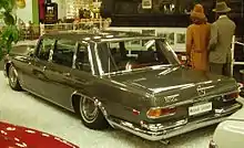 Mercedes also made two special 600 coupés: one as a gift for retiring long-time Mercedes chief designer Rudolf Uhlenhaut, and the other for Fritz Nallinger, head of the Mercedes research and development centre in the 1950s and 60s. These cars had a wheelbase 22 cm (8.6 inches) shorter than the SWB saloon. A third coupé was much later constructed by Karl Middelhauve from a SWB saloon.[7] Karl Middelhauve also created a questionable pair of matching Chevrolet El Camino-style coupes from 600 SWB saloons, one of them with a Vortech supercharger.[8] A single example of a SWB 4-door landaulet, combining the handling of a short-wheelbase with the qualities of a landaulet, was built by Mercedes in 1967 for former racing driver Philipp Constantin von Berckheim.