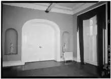 Directly across the hallway from the top of the staircase, on the northern side of the house, is the ballroom. Against the wall to the right of the door to the ballroom was an eight-legged George III mahogany sofa, circa 1770. Either side of the sofa was a pair of carved polychrome and giltwood lamps in the Chinese taste. They were standing on a pair of painted wood and tole pedestals. Above the sofa was a portrait of the Reverend Rhodes by Thomas Hudson.[19]