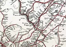 The railroad ran from Somerset Junction on the Belvidere Delaware Rail Road via Pennington and Hopewell to Millstone. A connection to the Millstone and New Brunswick Railroad for a through route to New Brunswick. The bridges over the river and canal at East Millstone were completed by November 22, 1873 [1][2] by January 10, 1874, the was completed but only a portion open to traffic[3][4] the line was fully opened to traffic by March 7, 1874.[5][6] The Mercer & Somerset Railway lost its battle with the Delaware and Bound Brook Railroad. Thus, it was bankrupt, defunct and dismantled by 1880. A stone pillar in the middle of the Millstone River just south of Amwell Road still remains today, built as part of the infrastructure to carry the tracks across the river. Hopewell was the site of a frog war with the National Railway.
