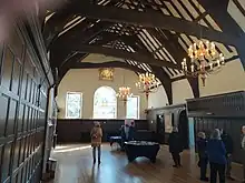It received a new cladding in the seventeenth century. The main hall is 60 by 30 feet (18.3 by 9.1 m), with 30 feet (9.1 m) ceilings. The adjoining Counsel House (sometimes called the Counting House) contains two stained glass windows by York glass painter Henry Gyles. The south window shows Queen Anne, and was made to commemorate her accession to the throne while the side window depicts the coat of arms of the London Company of Merchant Taylors.[2]
