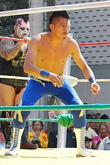 Abraham Arrieta González is a Mexican luchador, or professional wrestler currently working for the Mexican professional wrestling promotion Consejo Mundial de Lucha Libre (CMLL) working under the ring name Mercurio (Spanish for Mercury). As Mercurio González works in CMLL's Mini-Estrella division, which does not necessarily mean that Mercurio is a dwarf as several wrestlers who are just shorter in stature work in the "Mini" division.[4] Mercurio's real name was not a matter of public record while masked, as is often the case with masked wrestlers in Mexico where their private lives are kept a secret from the wrestling fans.[5]