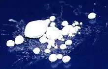 The name calomel is thought to come from the Greek καλός "beautiful", and μέλας "black"; or καλός and μέλι "honey" from its sweet taste.[4] The "black" name (somewhat surprising for a white compound) is probably due to its characteristic disproportionation reaction with ammonia, which gives a spectacular black coloration due to the finely dispersed metallic mercury formed. It is also referred to as the mineral horn quicksilver or horn mercury.[4]