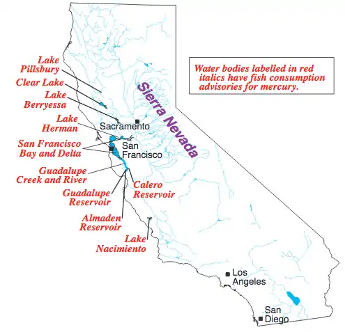 Mercury contamination in California waterways poses a threat to both the environment and human health. This naturally occurring heavy metal may be released into the environment from natural geological sources, but most commonly occurs from anthropogenic mining operations. This metal poses a threat not only for its effects on organisms, but also for difficulty of removal from waterways and the trouble in efficiently detecting it. The roots of mercury poisoning in waterways began with the historic mining of gold within California's streambed and hillsides; since the California Gold Rush, mercury has been used for gold extraction for its ability as a catalyze with the precious metal. due to the process of extraction and washing, mercury used would either be burned away as a hazardous vapor, or washed away into waterflows, resulting in widespread contamination of river and lake sediments. mercury continues to be released today through anthropogenic sources, though state and federal agencies work to manage and ban these practices and to mitigate its effect on the environmental and on people. Many water bodies in the state of California bear fish consumption advisories due to mercury content.