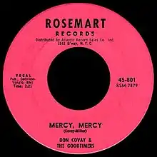 Rosemart Records released "Mercy, Mercy", with the artist name "Don Covay and the Goodtimers", as a single by in August 1964.[9] Producer Abramson's former label Atlantic picked up the distribution and it entered the Billboard Hot 100 on September 5, 1964.[9] The single reached number 35 during a stay of ten weeks on the chart.[9] It was also a best seller in the R&B market, reaching number one on the Cash Box R&B chart (Billboard's R&B chart was suspended at the time).[10]