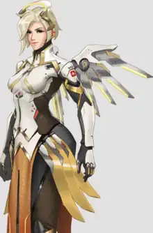 Mercy was one of the first twelve Overwatch characters introduced at Blizzard's BlizzCon 2014 event.[1] A Polygon story covering the event noted Mercy was equipped with feathery wings, a healing stream, and a pistol.[1] Mercy is voiced by Lucie Pohl, a German-American voice actress.[2] While Blizzard had been trying to find an actor native to the area that could perform a good Swiss-German accent, they found Pohl's accent to be good for the character and selected her instead, according to lead writer Michael Chu.[3]