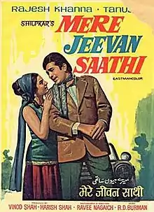 Mere Jeevan Saathi (My Life Partner) is a 1972 Indian film produced by Harish and Vinod Shah. It is directed by Ravikant Nagaich, and it stars Rajesh Khanna, Tanuja, Sujit Kumar, Bindu, Helen,[2] Utpal Dutt, Nazir Hussain and Rajindranath. The movie was made at the height of Rajesh Khanna's popularity and craze. It was the second movie of Rajesh Khanna with Tanuja after the blockbuster Haathi Mere Saathi (1971). Although the movie was an average grosser upon its release and received ambivalent reviews from viewers and critics but the soundtrack and songs became very popular and are evergreen. "O Mere Dil Ke Chain" and "Chala Jata Hoon" are still very famous Kishore Kumar melodies from this film.