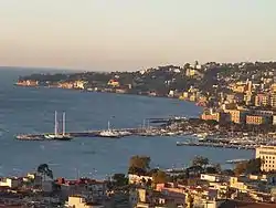 Mergellina is a coastal district of the city of Naples, Italy. It is located in the quartiere of Chiaia. It stands at the foot of the Posillipo Hill and faces the Castel dell'Ovo. Some people say the name derives from "mergoglino", a local name for the smew, others believe it is a corruption of "Mare Giallo", which refers to when the sea turned yellow due to floating tufa rock dust following a volcanic eruption many centuries ago. However, very likely the real origin of the name is from Latin "mare ialinum", that stands for clear, transparent sea.[1]