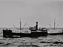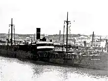 The Merisaar was a 2,348-ton merchant steamer built in Austria-Hungary in 1900. She was 290 ft. long with a breadth of 42 ft. and 18 ft. of draught. Originally named Anna Goich, she was sold to Estonian interests after WWI and after Merilaid acquired the ship in 1930 she was renamed Merisaar. Merisaar's home port of Tallinn is clearly seen in aft views of the ship.[9]