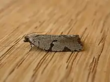 The wingspan is about 20 mm. Adults males have grey wings with dark marks on the costa of each forewing. In the female, these markings are paler but outlined in black. The hindwings are pale brown with darker veins.[2]