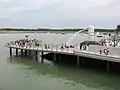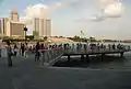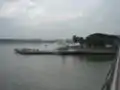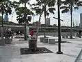Upon the completion of the Esplanade Bridge in 1997, the original Merlion Park location was also no longer the entrance of Singapore River and the statue could no longer be viewed clearly from the Marina Bay Waterfront.[3] On 23 April 2002, the statue was relocated to a new pier specially built on the other side of The Esplanade Bridge adjacent to The Fullerton hotel. The move, which cost $7.5 million, was completed on 25 April 2002.[6] On 15 September 2002, then-Senior Minister Lee Kuan Yew ceremonially welcome the Merlion again on its new location, the current Merlion Park, which is four times bigger than the original site.[7]