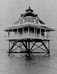 The shoal was first marked by a lightship beginning in 1847, but this was replaced by a screw-pile light in 1860. The light was extinguished by the Confederates but was undamaged, and was re-lit in 1863. The house was damaged by fire in 1880, and was utterly destroyed in 1883 by another fire; it was rebuilt the same year.[3] In 1932 it was automated, and in 1945 the house was removed and replaced by a skeleton tower on the same foundation.[4] This tower was damaged by the hurricanes of 2005 and was discontinued in 2007.[5]