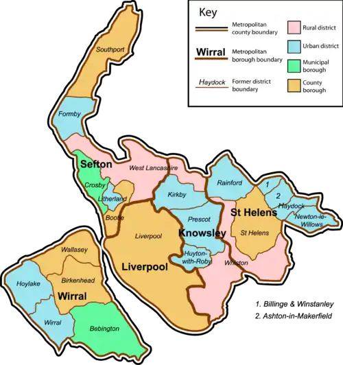 ![]() Merseyside is an amalgamation of 22 former local government districts, including six county boroughs and two municipal boroughs. |