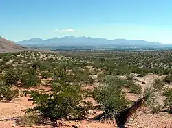 The fertile Mesilla Valley extends from Radium Springs, New Mexico, to the west side of El Paso, Texas.[1] The valley is characterized by its few remaining bosques, as well as its native cottonwood trees, and increasingly, by invasive tamarisk, which was introduced in the late 19th century, and is known locally as salt cedar.