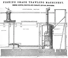 Capstan winches were also important on sailing trawlers (e.g. Brixham trawlers) as a means for fetching in the nets after the trawl. When they became available, steam powered capstan winches offered a great saving in effort. These used a compact combined steam engine and boiler below decks that drove the winch from below via a shaft. Ruston, Proctor and Company at the UK 1883 Fisheries Exhibition marketed an engine, boiler, shafts and capstan designed specifically for this task.[5]